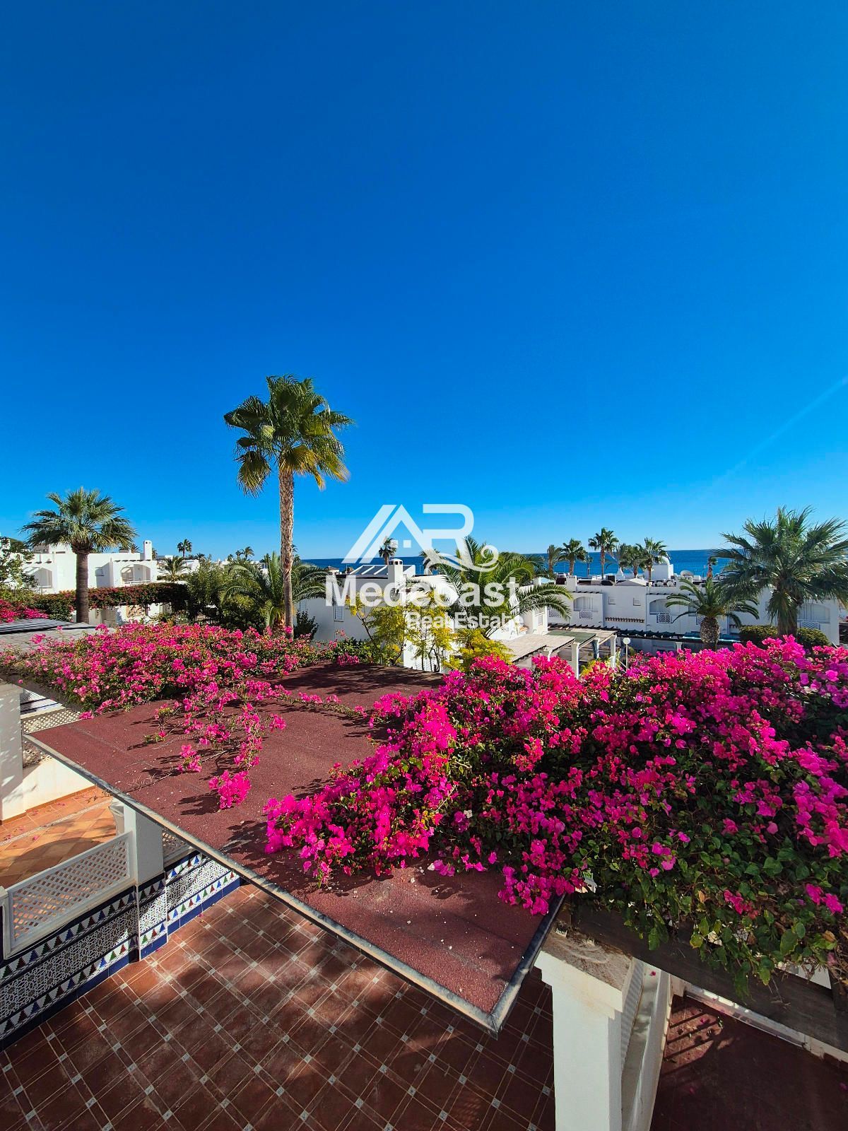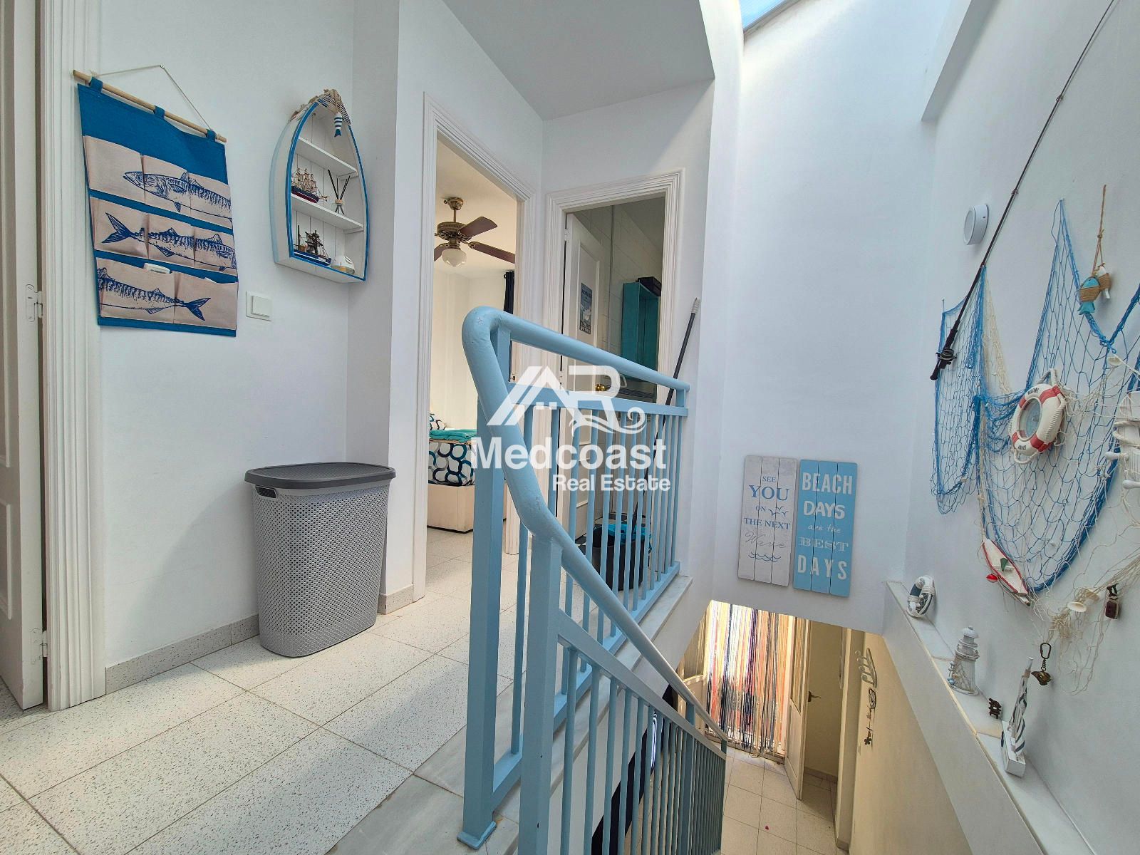 La planta superior alberga tres dormitorios dobles y un baño familiar. El dormitorio principal destaca por su balcón privado, desde el cual se pueden contemplar vistas al mar y a la urbanización.
