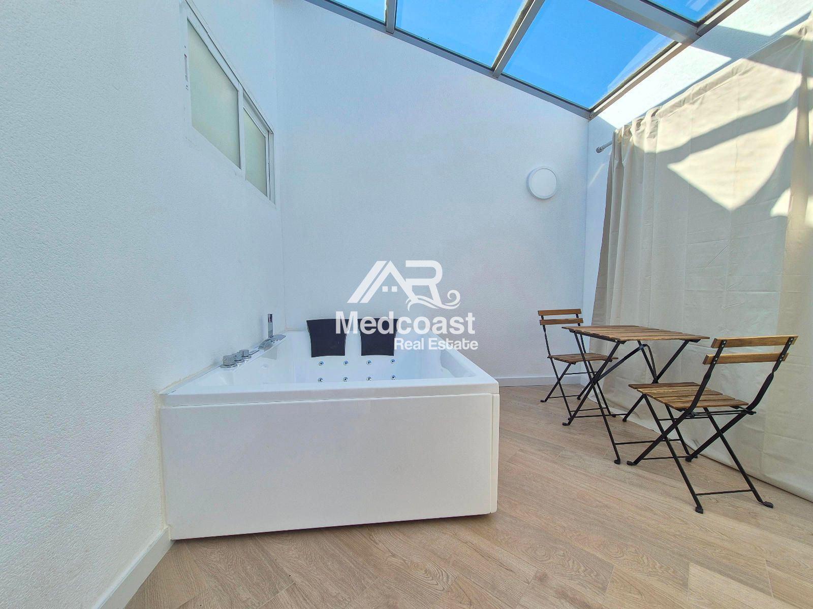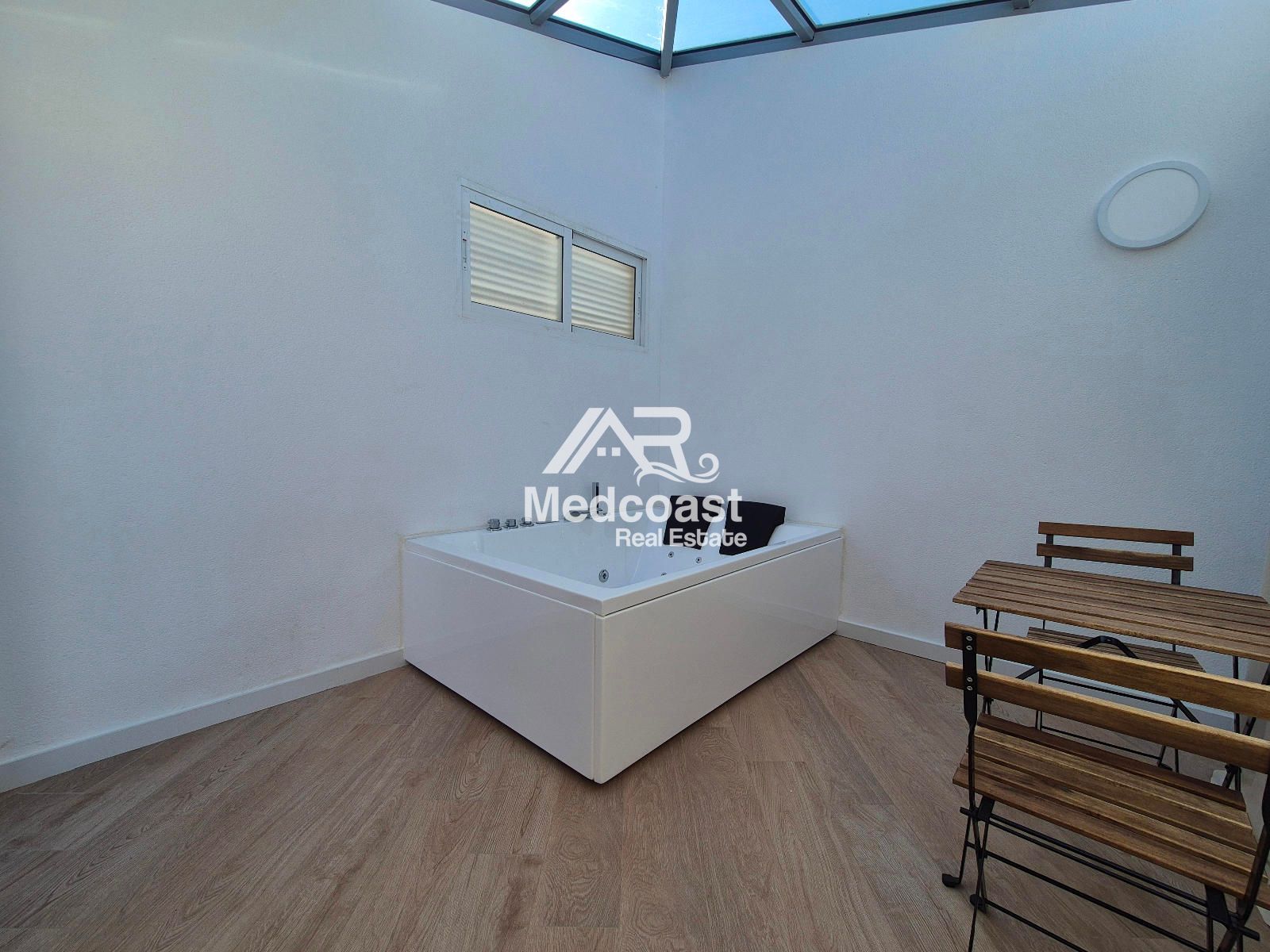 Desde el salón se accede a una agradable terraza que, a través de una escalera privada, conecta con un espectacular solárium. En esta planta superior encontramos una zona acristalada que alberga un moderno jacuzzi con sistema Bluetooth, creando un espacio exclusivo para el relax y el disfrute durante todo el año.